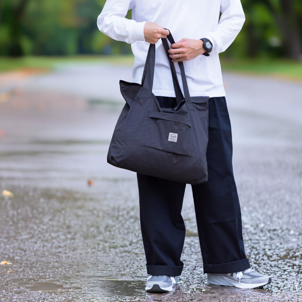 防水性と使い勝手を兼ね備えるため、ダブルファスナーで開けやすくする一方で、ファスナーから水が入らないように、フラップ付きで見た目もキレイに。持ち手にクッションも入っており、肩にかけたときの負担を減らしています。