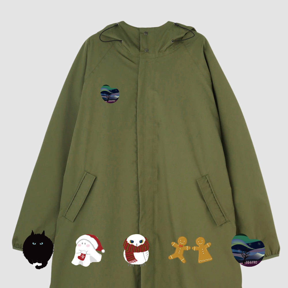 RAINCOATやWATERPROOF MODS COATよりも横幅をゆったりとさせたパターンにし、前裾から後ろの裾までの角度も上記2コートよりも緩やかにし、より街着としても使いやすく変更しました。ゆったりシルエットで体のラインもわかりにくいデザインです。フロントはダブルジップで、普段使いもしやすい仕様。