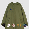 M-L:前着丈86cm×後着丈108.6cm×バスト58.5cm×裄丈90cm×裾周り142cm×袖巾26.5cm×袖口20cm×フード高さ38.5cm×フード奥行24cm×フード口66cm