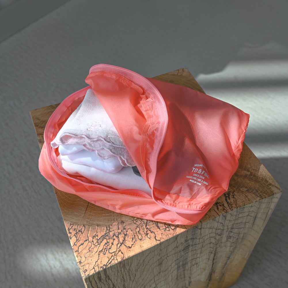 タオルや下着、靴下、インナーなどの収納に最適。バッグやキャリーケースの中でバラけず、シワになりにくいすっきりした状態をキープします。もちろんご自宅の収納ボックスやたんすでもお使いいただけます。