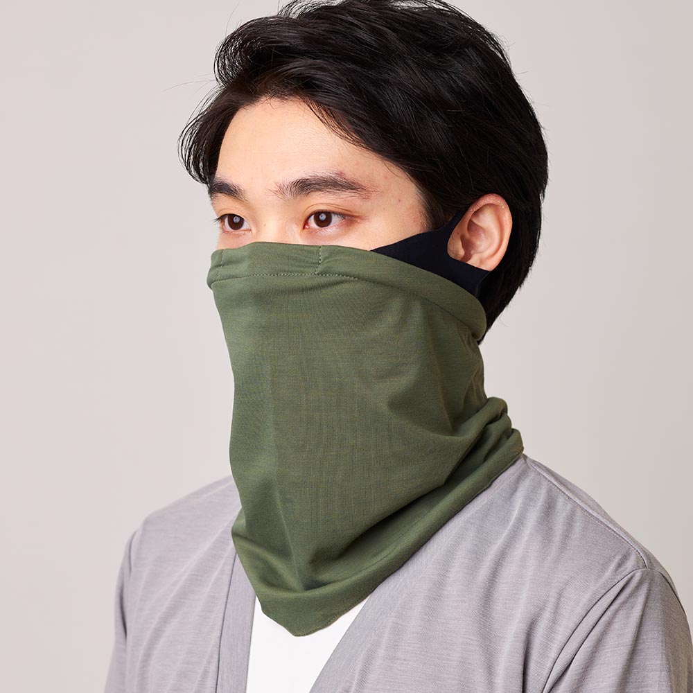 外側に吸水速乾、抗菌防臭機能のある柔らかな風合いの生地「Feral Pigion」を使用し、肌側には抗ウイルス機能を持ったクレンゼ®加工生地を使用した2WAYのネックゲイターです。