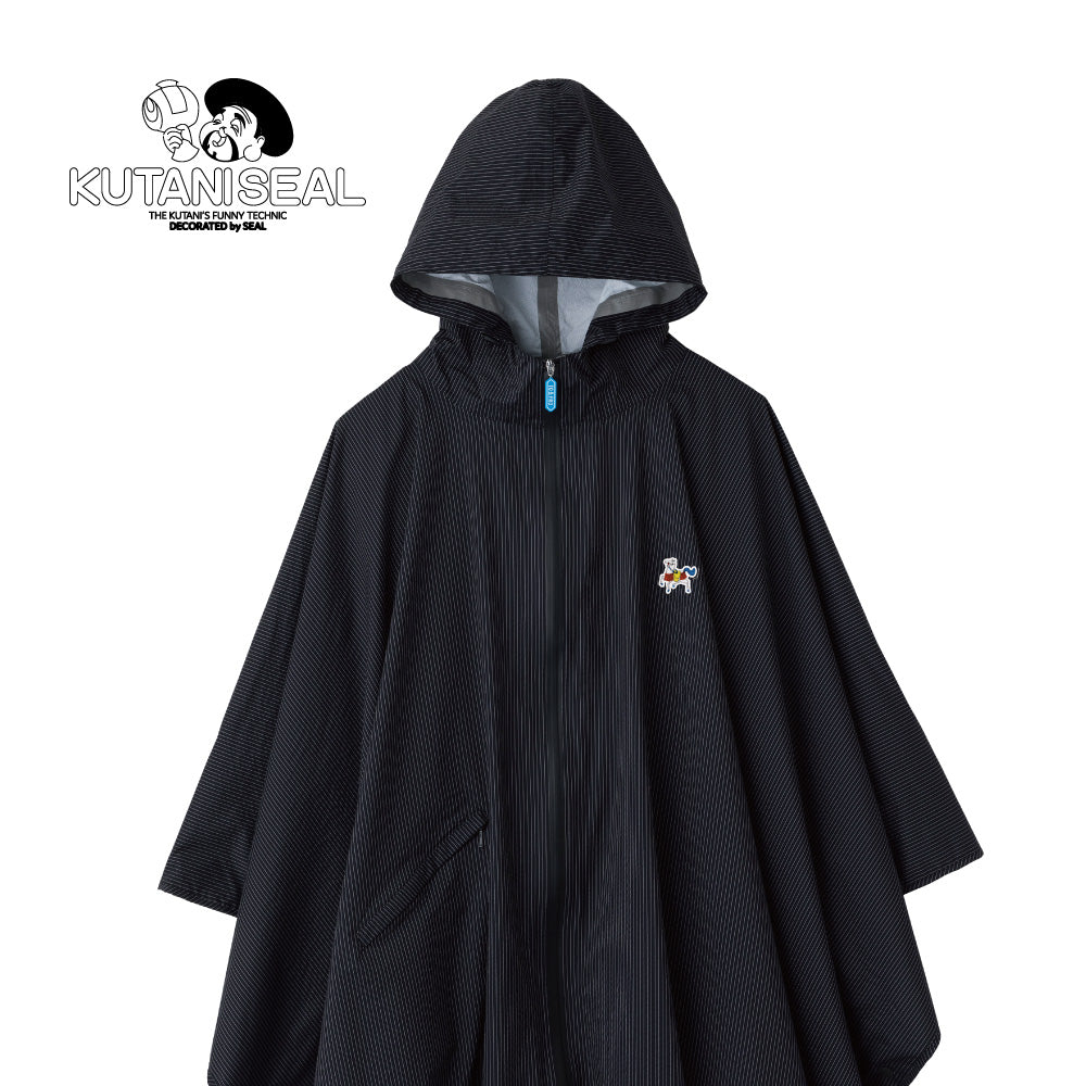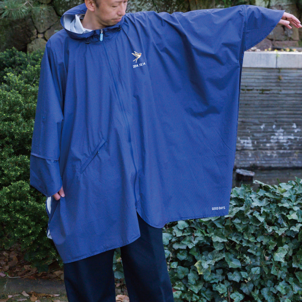 急な雨が降ってもすぐに着られるレインポンチョ。広げると136㎝もあるゆったりとしたシルエットで、付属の収納ポーチに入れれば、手のひらサイズにコンパクトに収納できます。