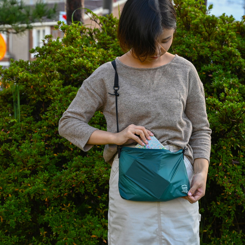 MINIサイズの超軽量ショルダーバッグには、内ポケットが3つ。財布や身の回りの小物をさっと入れられるサイズ感に設定し、サコッシュとして使いやすいショルダーバッグです。内1つのポケットにはパッカブルに収納もできます。